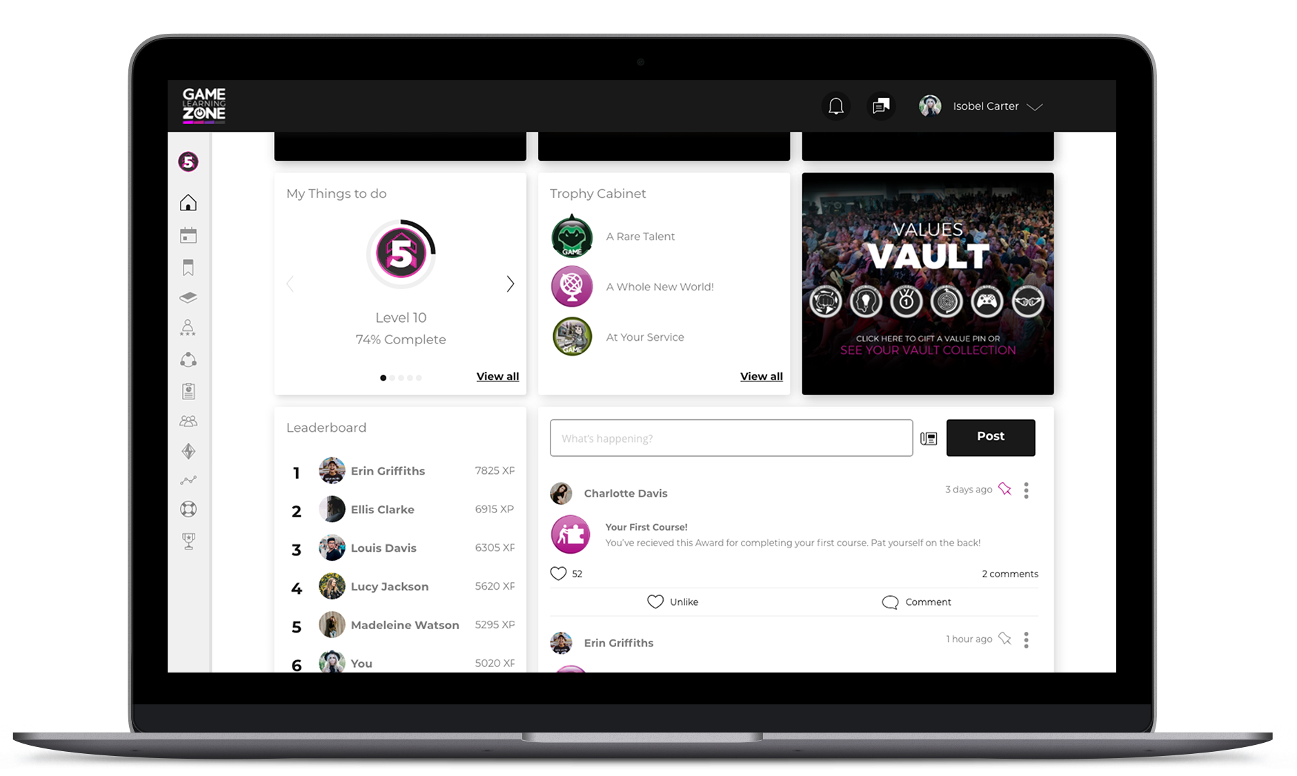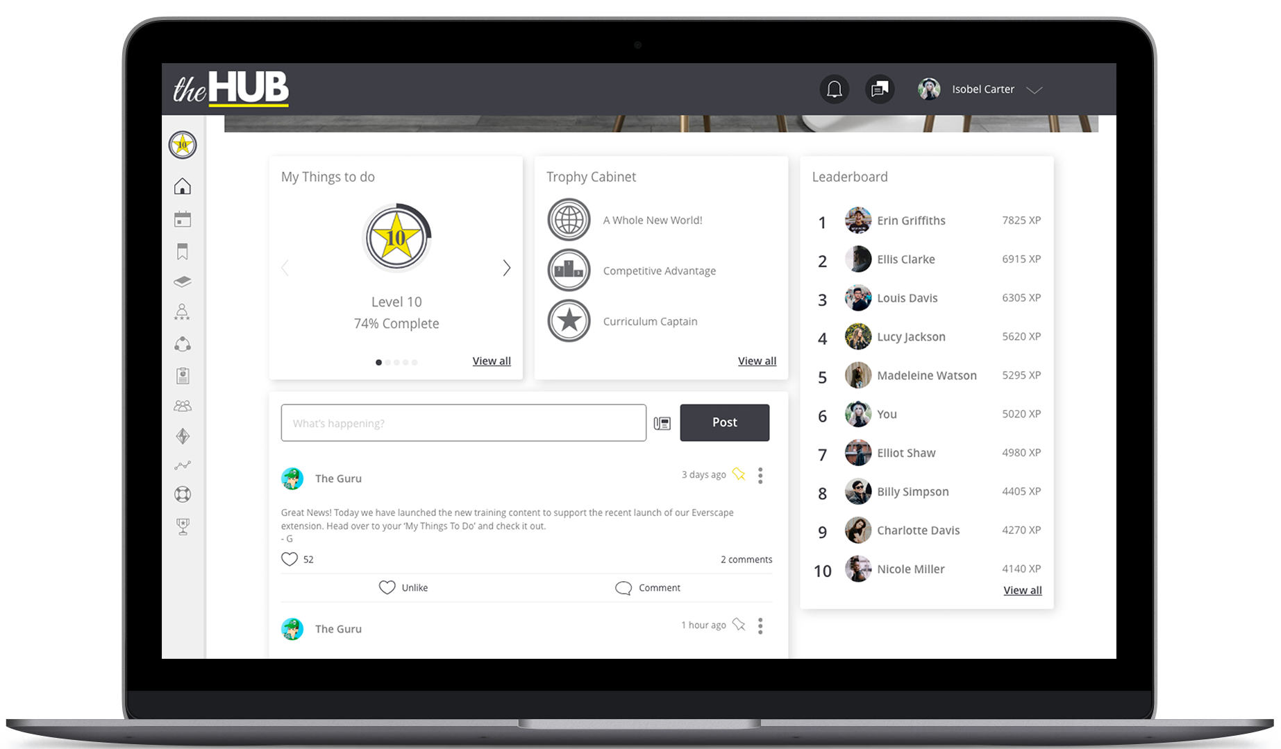 The platform also utilised a bounty of social features to help cultivate a genuine learning community. Learners across the platform even interacted with an admin-controlled character called ‘The Guru’. This character provided learners with useful information, tips and best practice advice.