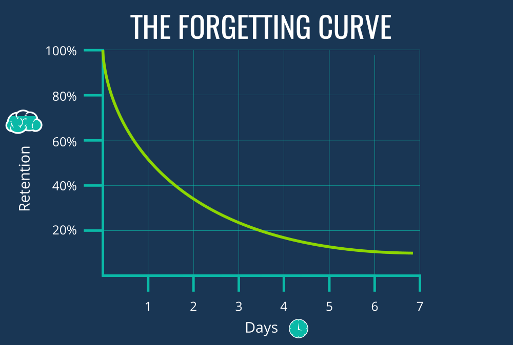 Ebbinghaus collated all the data from his spaced learning experiments and gave us his famous Forgetting Curve. He concluded that we forget an average of 90% of what we learn in the first month. As you can see, the amount we forget is truly staggering!