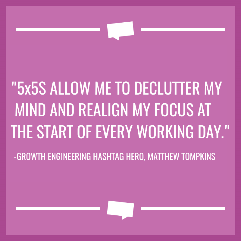 We invented 5x5s around five years ago (pure coincidence!) and use them at Growth Engineering to manage our weekly workloads. It’s simple! Identify five goals for your five working days. Everyone, including me, uses this system to set and track their core objectives for the week ahead. Of course, the goals must be specific, measurable, achievable, relevant and timed (SMART) to work!
